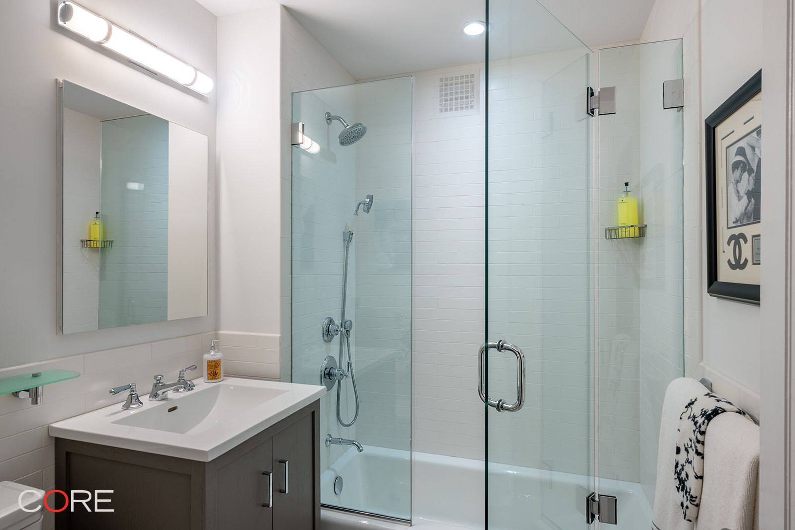 Featuring a pristine, windowed eat-in kitchen with high-end appliances and a coveted in-unit washer and dryer. The formal entry foyer leads to a gracious, large living room. The generously sized primary bedroom has a walk-in closet and an en-suite windowed marble bath with two pedestal sinks and a rain shower. The second bedroom is a similar size with a quiet southern exposure and two closets. The second bath is accessible from the common areas and features a glass-enclosed tub. Electricity is included in the common charges.