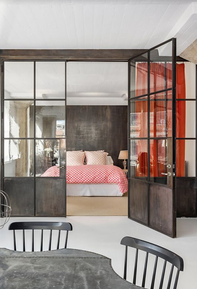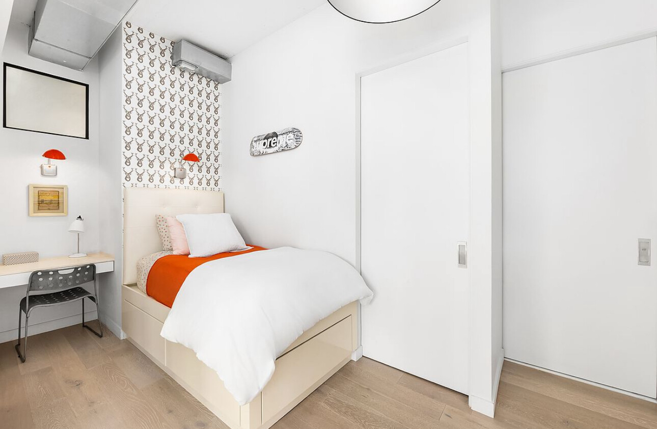 The bright second bedroom opens through a sliding iron and glass casement door. Off of this bedroom is a Jack and Jill bathroom complete with a marble countertop, porcelain sink basin, polished nickel finishes and clever storage. Crisp sea blue subway tile adorns the shower area which is bordered by a glass enclosure. Also adjoining the secondary bathroom is a spacious den outfitted as an additional sleeping area or home office.