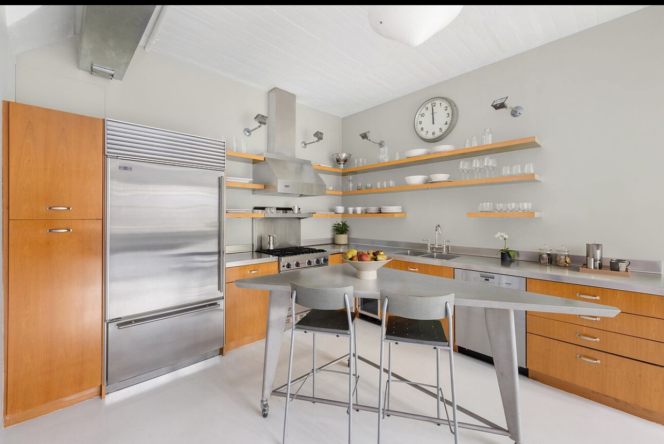 Off the great room is an open concept, top of the line chef's kitchen boasting a professional grade Viking refrigerator, Viking gas range with vented hood, Miele dishwasher and built-in wine cooler. The stainless steel countertops are complimented by light wood cabinetry below and open shelves above. There is ample storage and a separate laundry area tucked off of the kitchen, with a full-size washer and vented dryer.