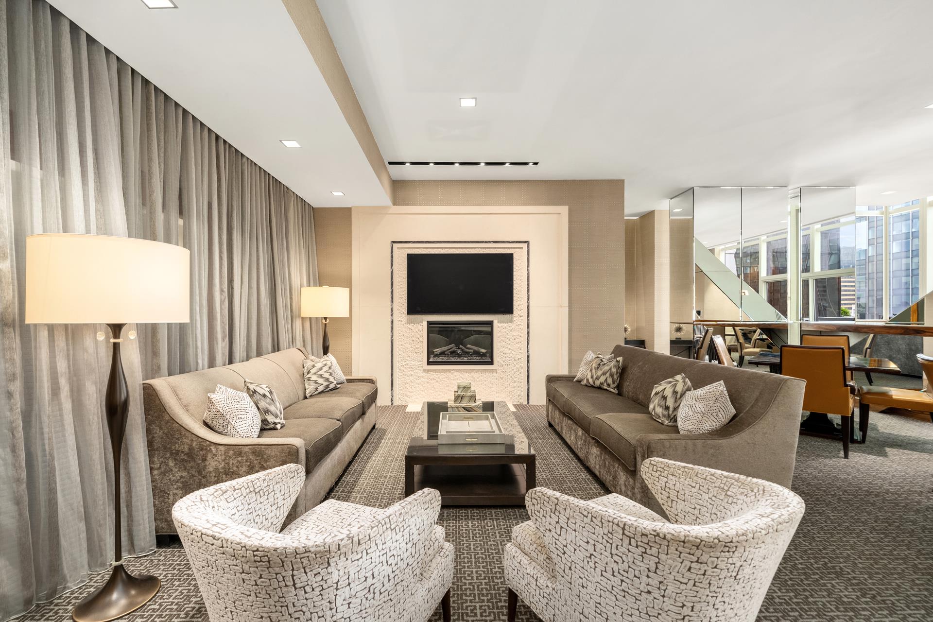 The secondary bedroom is generous in size, featuring a sizable closet as well as massive floor-to-ceiling windows. This bedroom also offers direct access to the main living space, which provides dramatic vistas from any furniture configuration. The true showstopper of this home, however, is the primary bedroom and primary spa bath. Discreetly tucked away in its own private suite, the primary bedroom provides optimal luxury, comfort, and quiet. The area offers copious closet space, an expansive floor plan, and a tranquil oasis of a primary bath complete with a deep soaking tub by Kohler, a glass-enclosed shower, stunning marble tile work, and a dual sink vanity with Waterworks fixtures.
