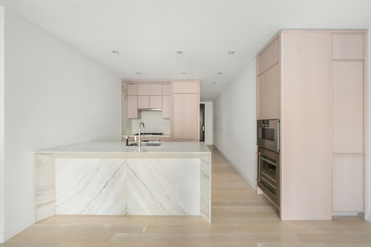 This elegant one-bedroom, one-bathroom residence, designed by Champalimaud, showcases sweeping northeast views of the Manhattan skyline through expansive floor-to-ceiling windows. White oak flooring extends from the entry foyer into a spacious open-concept living and dining area, anchored by a chef's kitchen featuring honed Capri marble countertops, backsplash, and a waterfall island with seating. The kitchen's refined aesthetic is defined by streamlined custom white oak cabinetry that seamlessly conceals a full Gaggenau appliance suite-including an undercounter wine refrigerator-and is complemented by Dornbracht fixtures.