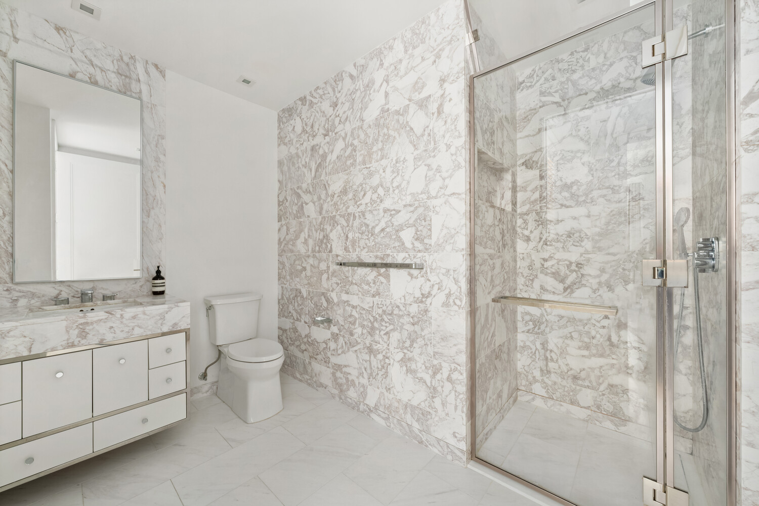 The tranquil, marble-clad primary bathroom is a retreat in itself, featuring Bianco Dolomiti radiant-heated floors, Marno Illusion stone-tiled walls, and a custom vanity in white oak rift-cut veneer with matching Marno Illusion countertops. Additional details include a built-in medicine cabinet, Kallista sink, and Dornbracht fixtures. Completing this sophisticated home are a Nest Learning Thermostat and an in-unit Bosch washer and dryer.