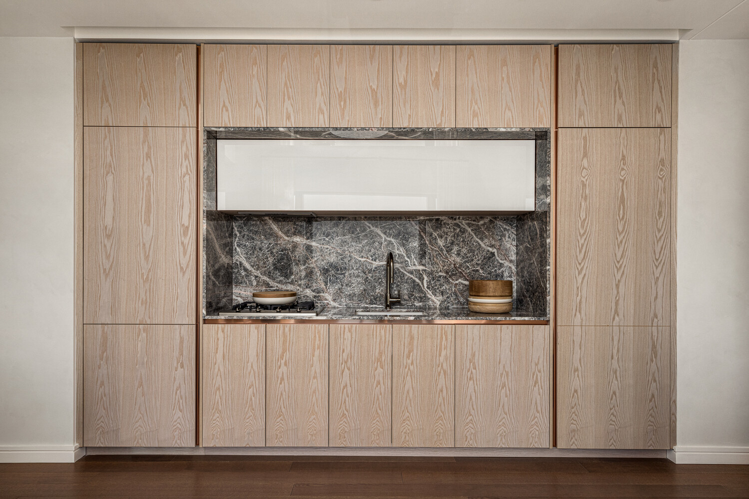 The formal entry foyer and gallery opens to the gracious living space, with 6" wide white oak flooring in light beige finish and a meticulously appointed powder room. The custom designed kitchen features a full suite of Miele appliances, a vented hood, polished nickel fixtures, cabinets in light beige finish, and Fior di Pesco Carnico marble countertops and backsplash.